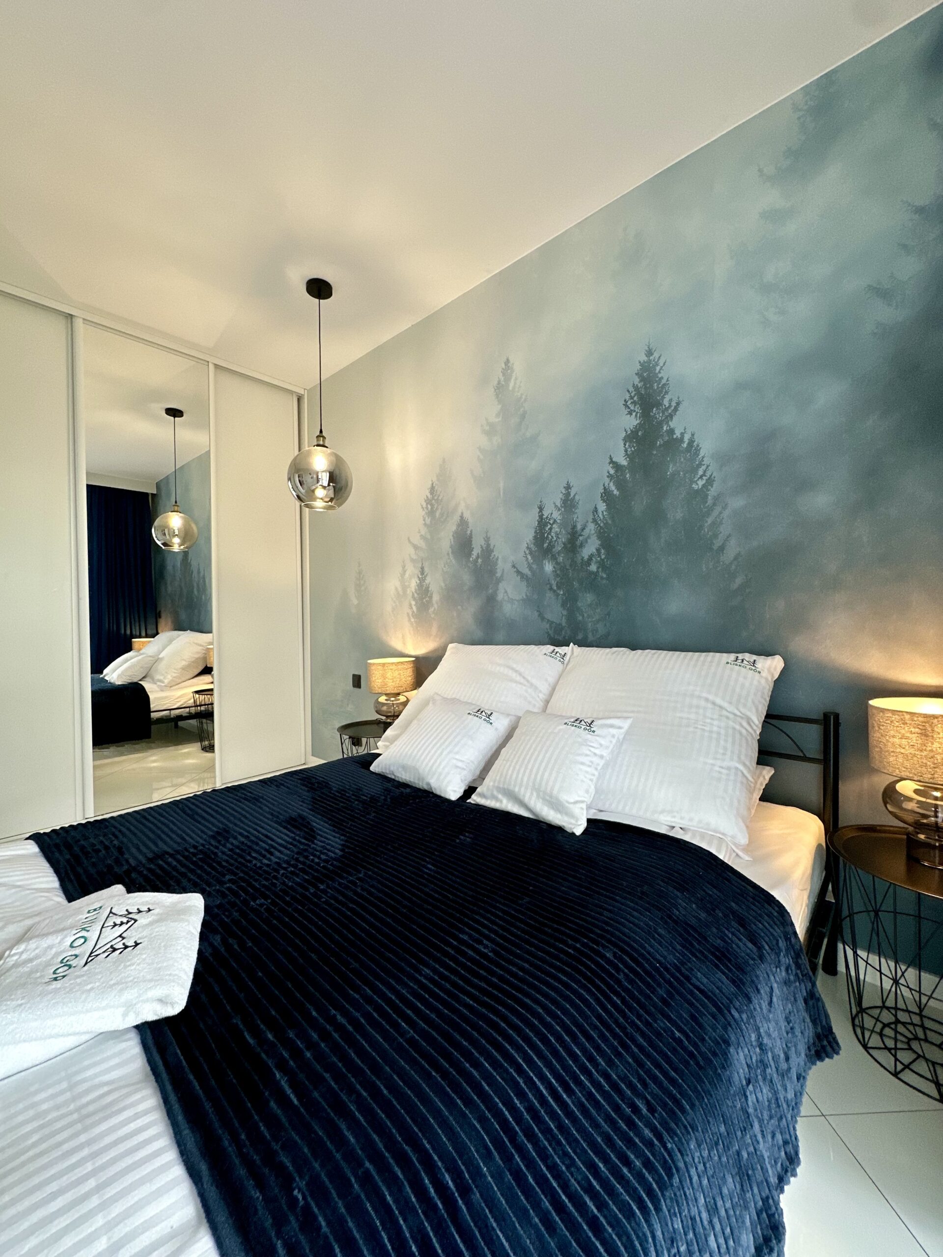 Sypialnia wyróżnia się łóżkiem małżeńskim (180×200 cm, z możliwością rozdzielenia), uzupełnionym o stoliki nocne i dużą szafę z dostępem na balkon